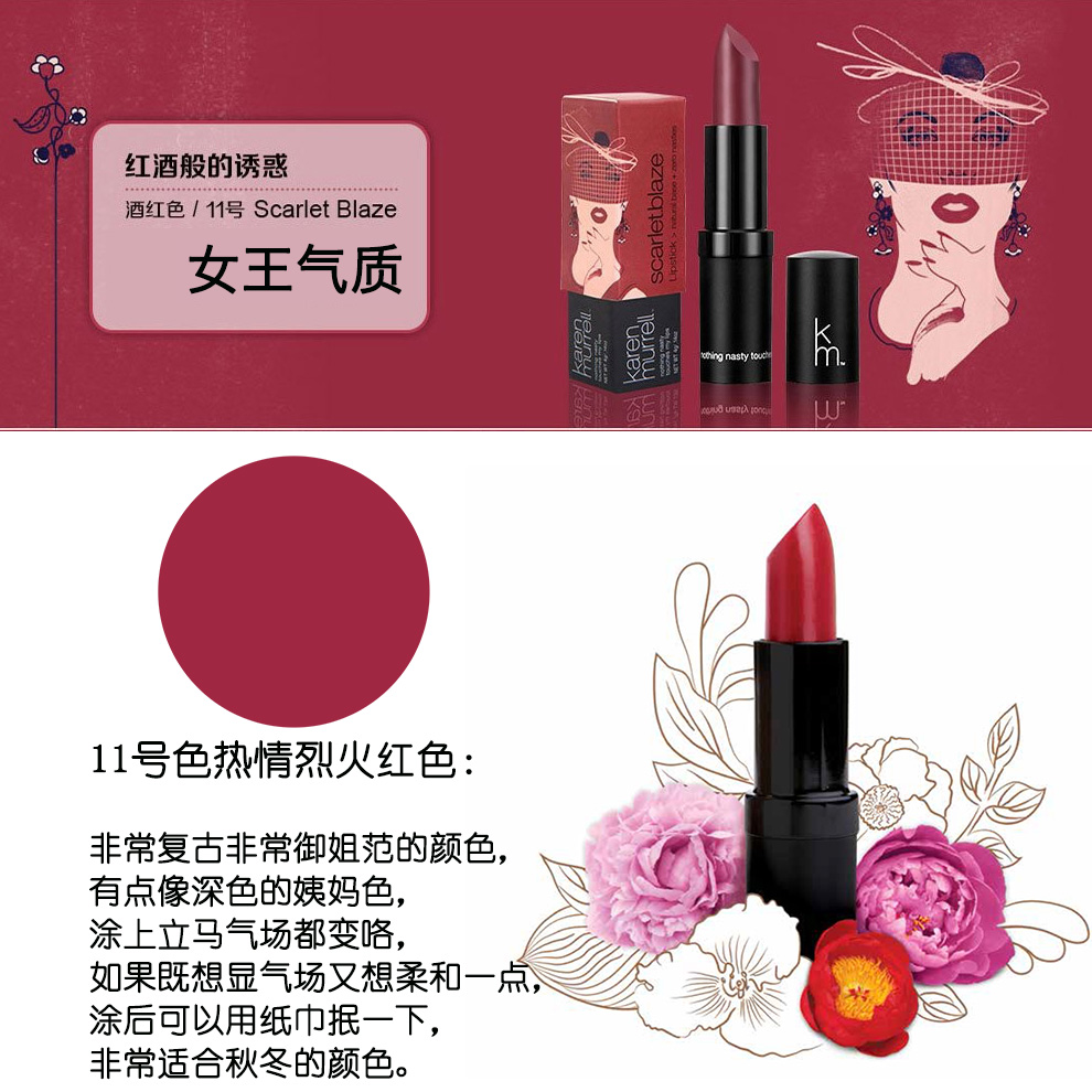 Karen Murrell 11号纯天然植物持久保湿 新西兰KM有机口红 4g