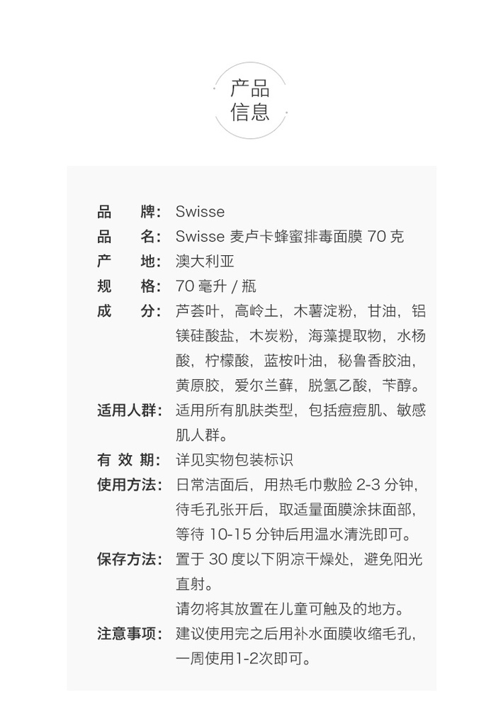 首页美妆护肤Skin Care MiscellaneousSwisse Swisse 麦卢卡蜂蜜清洁排毒面膜 70g